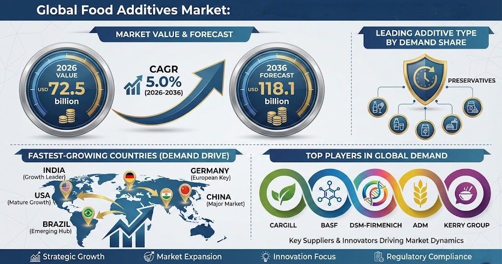 NEWARK, DE, UNITED STATES, January 28, 2026 /EINPresswire.com/ -- The global food additives market is expected to grow from USD 72.5 billion in 2026 to USD 118.1 billion by 2036, reflecting a compound annual growth rate (CAGR) of 5.0%, according to a comprehensive market forecast and analysis. This growth is fueled primarily by the essential functional role additives play in food manufacturing, supporting shelf stability, sensory consistency, and production efficiency across high-volume processed food sectors.